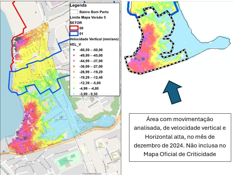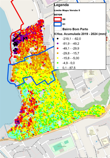 “Um dos mapas, por exemplo, mostra os pontos do Bom Parto onde o solo afundou mais de 5 milímetros por ano. Em alguns locais, esse valor chega a ultrapassar 20 ou até 50 mm/ano, o que é extremamente preocupante. E veja: esses pontos estão fora da zona oficialmente reconhecida como crítica, mesmo estando com velocidades acima de 5 milímetros, 4 vezes ou até 10 vezes, que é o critério adotado pela defesa civil”, esclarece.