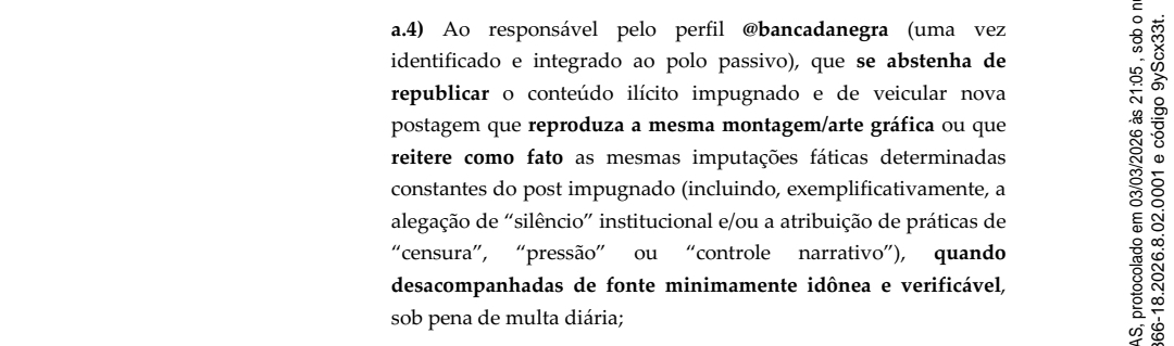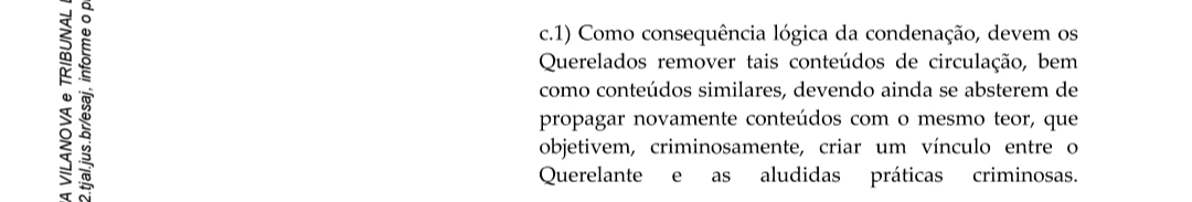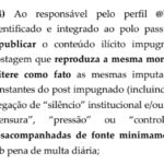 “Se há uma ordem de remoção de um conteúdo agressivo, calunioso ou que tenha tido algum excesso, tudo bem, mas daí a censurar previamente para que não volte a tocar no assunto novamente, isso é uma censura, porque você não sabe o que o jornalista vai fazer. Existe uma censura editorial, até o final do processo, que pode durar três, quatro anos, e até lá o jornalista não pode tocar nesse assunto? Então, sim, é uma censura prévia, viola os precedentes do Supremo Tribunal Federal, e é algo que vai de encontro a uma democracia e ao regime democrático brasileiro, o regime constitucional democrático brasileiro”.