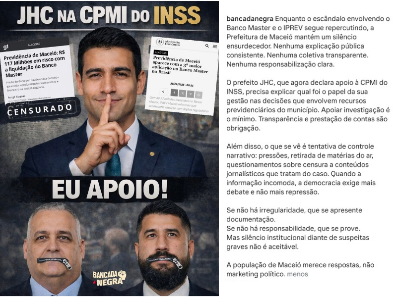 No caso do perfil da Bancada Negra, o coletivo apresenta publicações que pedem explicação ao prefeito sobre o caso, e levantam o apoio à campanha que pede a investigação de JHC na CPMI do INSS, ao tempo em que reclama do silêncio sobre o caso. A colagem utilizada e a publicação nas redes sociais foi utilizada como um “conteúdo maniefstamente ilícito” por, segundo os advogados de JHC, utilizarem de “montagem gráfica difamatória e legenda desinformativa”.