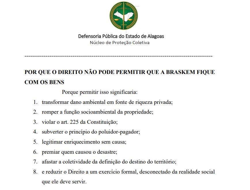 “A cláusula 58 não pode ser interpretada como se estivesse inserida em um contrato patrimonial típico. Ela integra um instrumento celebrado em resposta a um desastre ambiental, destinado a viabilizar a execução de obrigações impostas ao agente causador do dano. Por isso, sua redação não pode ser dissociada da lógica reparatória que estrutura todo o acordo”, argumenta o defensor. “a leitura das cláusulas dos acordos deve ser feita à luz de sua função social concreta e da finalidade que lhes deu origem. A titularidade atribuída à Braskem não pode ser compreendida como direito patrimonial pleno, porque não é isso que a realidade comporta. O que se admitiu foi uma titularidade